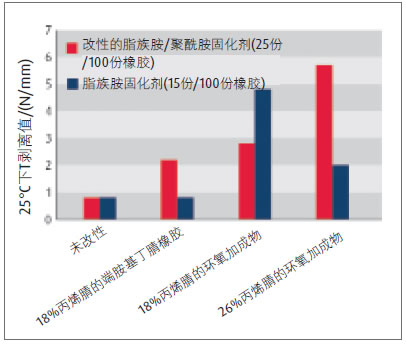 圖8 加入端氨基丁腈橡膠或環氧加成物的雙組分胺固化環氧膠黏劑的增韌性