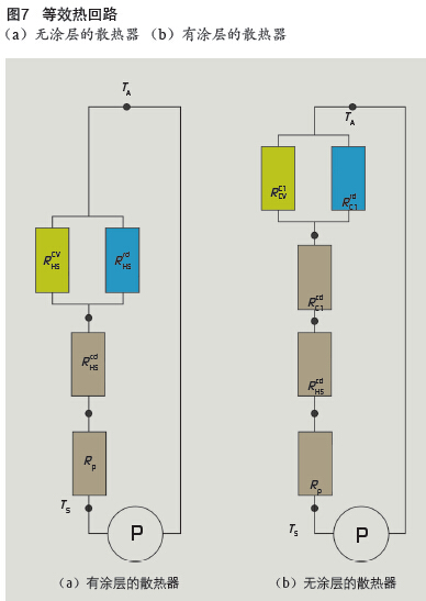 在散熱器表面增加一層涂層時,系統(tǒng)總熱阻的公式變成(見 圖7b):