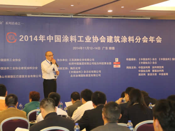 2014年11月13日,以“新技術(shù)、新功能、綠色環(huán)保、藝術(shù)造型”為主題的2014年中國涂料工業(yè)協(xié)會建筑涂料分會年會在廣東順德召開。中國涂料工業(yè)協(xié)會秘書長楊淵德、中國涂料工業(yè)協(xié)會建筑涂料分會理事長徐理德、廣東省涂料行業(yè)協(xié)會會長黃開、順德涂料商會會長胡景釗、住建部政策研究中心房地產(chǎn)處處長趙路興、北京市環(huán)境保護(hù)科學(xué)研究院副研究員聶磊、中國建筑材料檢驗(yàn)認(rèn)證中心副總工程師梅一飛、中國涂料工業(yè)協(xié)會顧問劉國杰、中國涂料工業(yè)協(xié)會專家委員會主任劉登良以及巴德富、杜邦鈦白科技、潤泰化學(xué)、陶氏化學(xué)、立邦涂料、嘉寶莉、華潤等150余名涂料企業(yè)領(lǐng)導(dǎo)、專家、業(yè)界人士出席年會,共同見證了會議的隆重開幕。