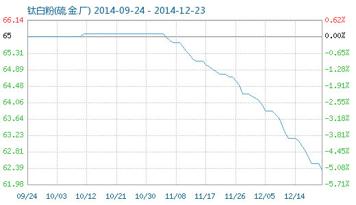 12月23日鈦白粉(硫.金.廠)商品指數(shù)為62.17,較昨日下降了0.16點(diǎn),較周期內(nèi)最高點(diǎn)100.00點(diǎn)(2011-09-04)下降了37.83%,較2014年04月13日最低點(diǎn)61.70點(diǎn)上漲了0.76%。(注:周期指2011-09-01至今)