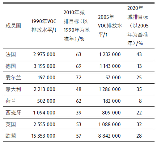 與1990年的排放相比,德國在2011年僅達(dá)到了減少NMVOC排 放69%(從3 195 000 t減少至995 000 t)的目標(biāo)。只有愛爾蘭采用 較嚴(yán)格的要求(72%)。由于未達(dá)到2010年的目標(biāo),德國2020年 設(shè)定的目標(biāo)值相同,減排要求非常低:相對(duì)于2005年的減排水平 (目前作為基準(zhǔn)年),減少13%的NMVOC排放(從1 143 000 t減少 至995 000 t)。在所有的國家中,德國的2020年的減排要求是最 低的。只有2個(gè)較小國家的減排要求更低:愛沙尼亞為10%,荷蘭 為8%。