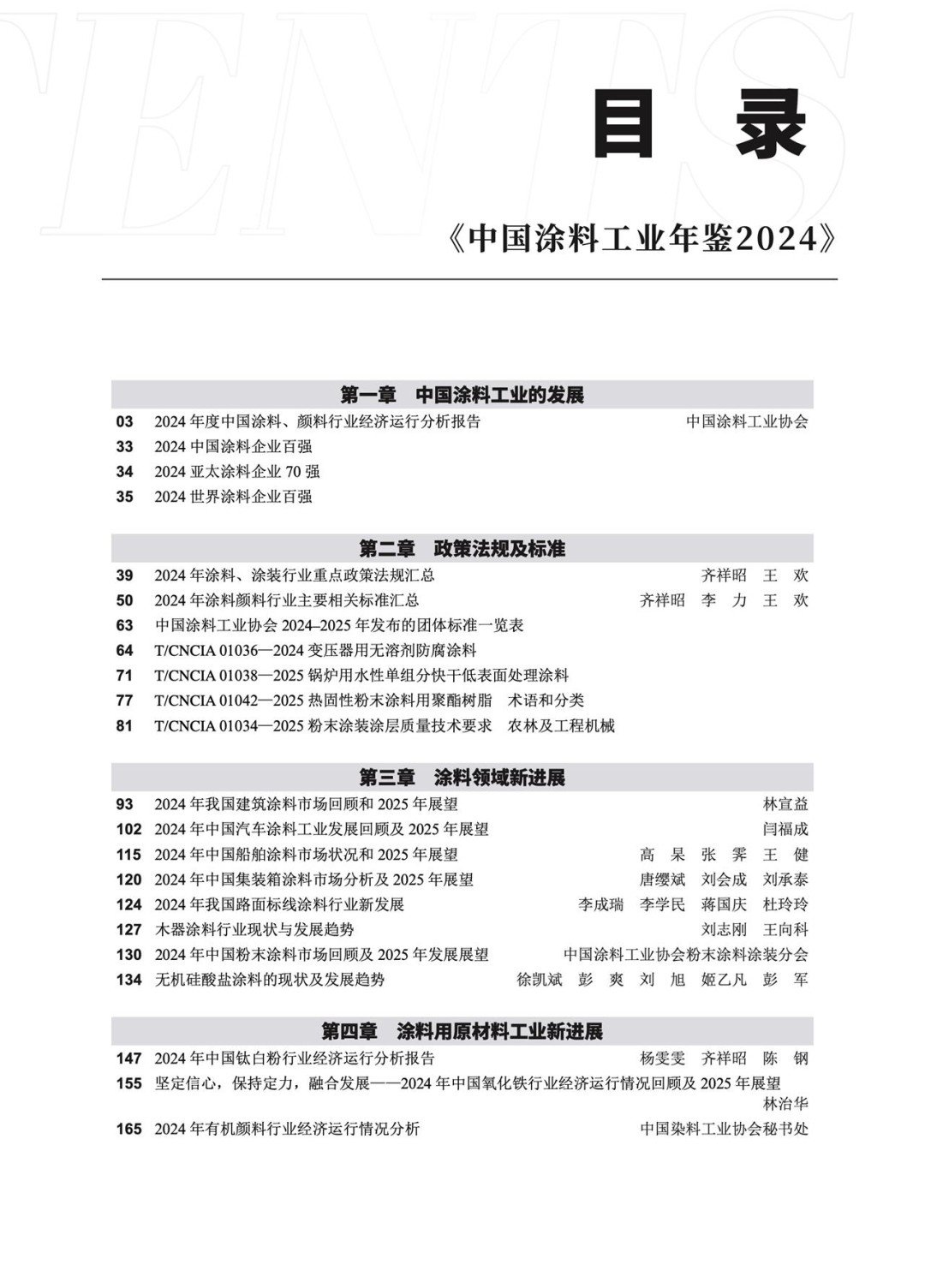 第一章,中國涂料工業的發展。對2024年主要下游行業及國內涂料行業規模以上企業的經濟運行情況進行了深入分析,總結了涂料行業的運行特點,預判了2025年的發展趨勢。并全方位分析了2024年全球涂料行業發展概況及細分領域走勢。并在行業調研的基礎上,由中國涂料工業協會繼續發布了中國涂料企業百強、亞太涂料企業70強、世界涂料企業百強。