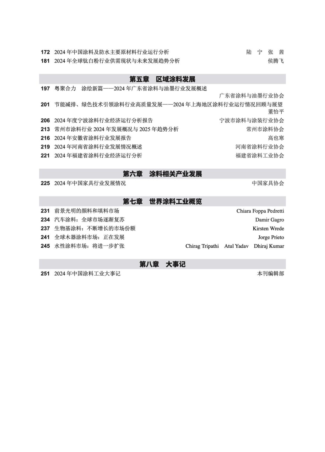 第三章,涂料領域新進展。全面深入反映了我國建筑涂料、汽車涂料、船舶涂料、集裝箱涂料、道路交通標線涂料、木器涂料、粉末涂料、無機涂料等重要涂料領域2024年度或近年來經濟運行、市場狀況、技術新進展及未來發展。