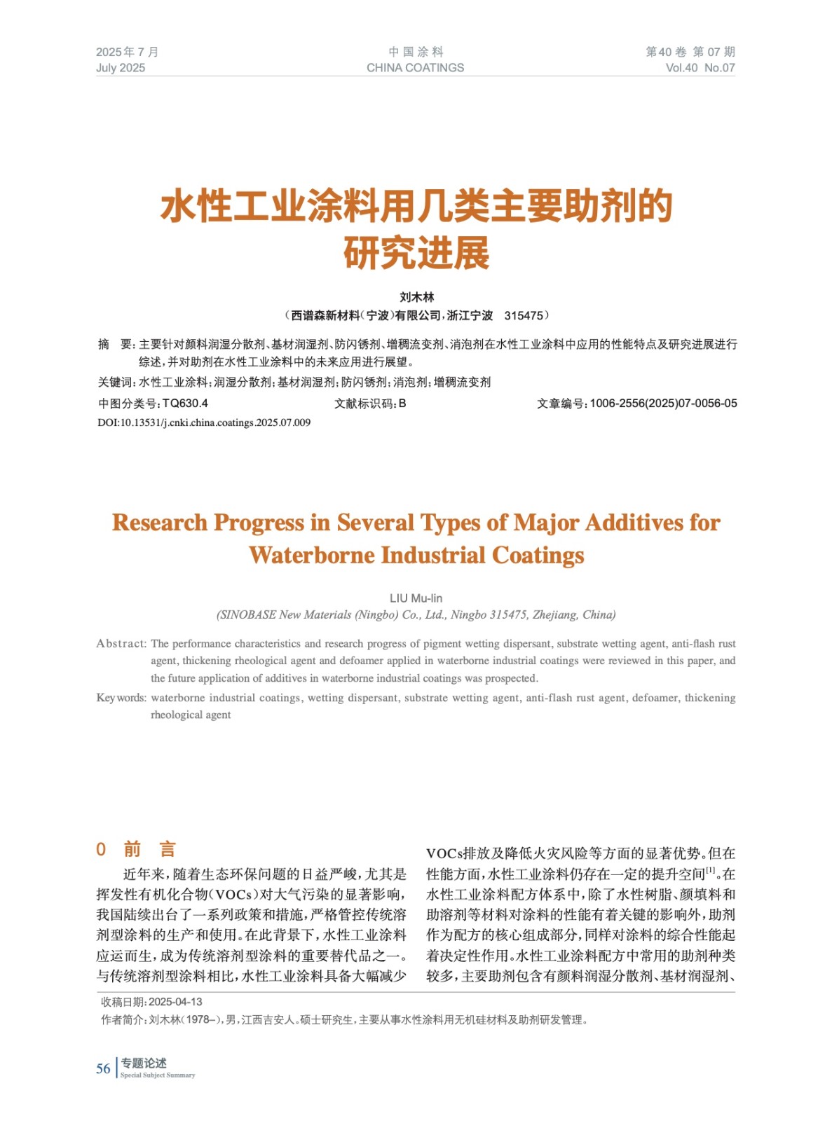 主要針對顏料潤濕分散劑、基材潤濕劑、防閃銹劑、增稠流變劑、消泡劑在水性工業涂料中應用的性能特點及研究進展進行綜述,并對助劑在水性工業涂料中的未來應用進行展望。