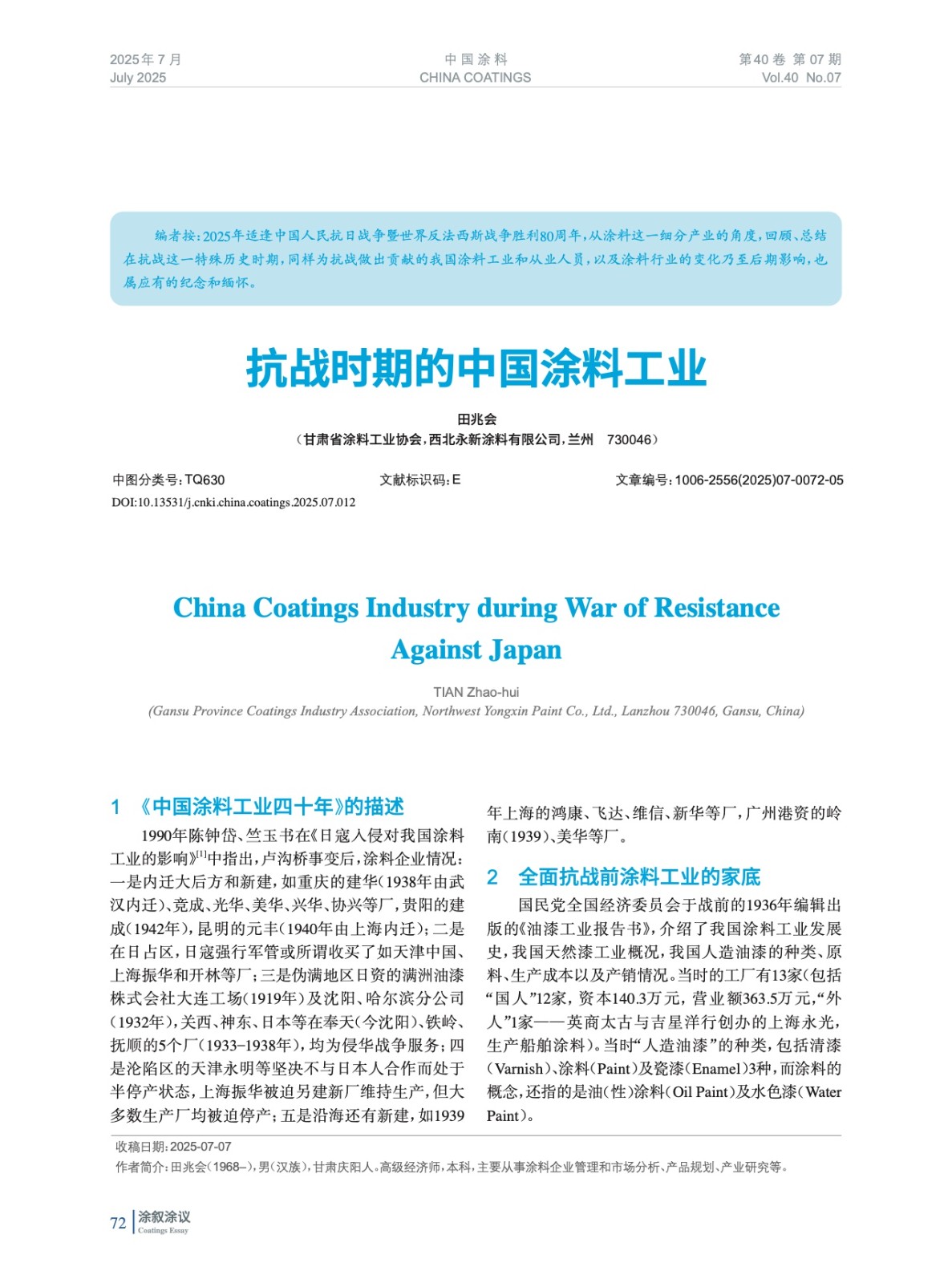 2025年適逢中國人民抗日戰爭暨世界反法西斯戰爭勝利80周年,從涂料這一細分產業的角度,回顧、總結在抗戰這一特殊歷史時期,同樣為抗戰做出貢獻的我國涂料工業和從業人員,以及涂料行業的變化乃至后期影響,也屬應有的紀念和緬懷。