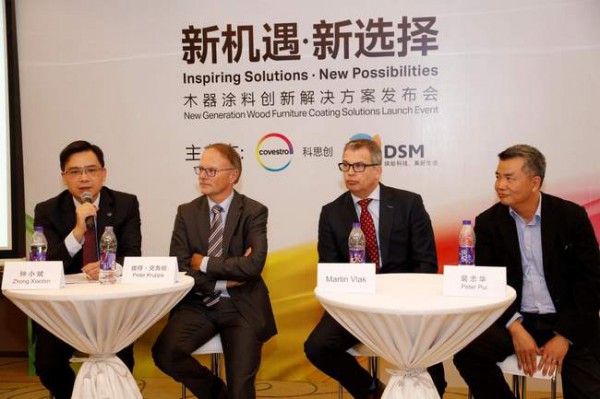 (左起)科思創(chuàng)涂料、粘合劑及特殊化學(xué)品業(yè)務(wù)部亞太區(qū)高級(jí)副總裁鐘小斌,科思創(chuàng)涂料、粘合劑及特殊化學(xué)品業(yè)務(wù)部應(yīng)用與技術(shù)開發(fā)主管彼得·克魯帕,帝斯曼涂料樹脂特種樹脂業(yè)務(wù)部全球商務(wù)總監(jiān)Martin Vlak,和帝斯曼涂料樹脂亞太區(qū)商業(yè)總監(jiān)裴忠華回答媒體提問
